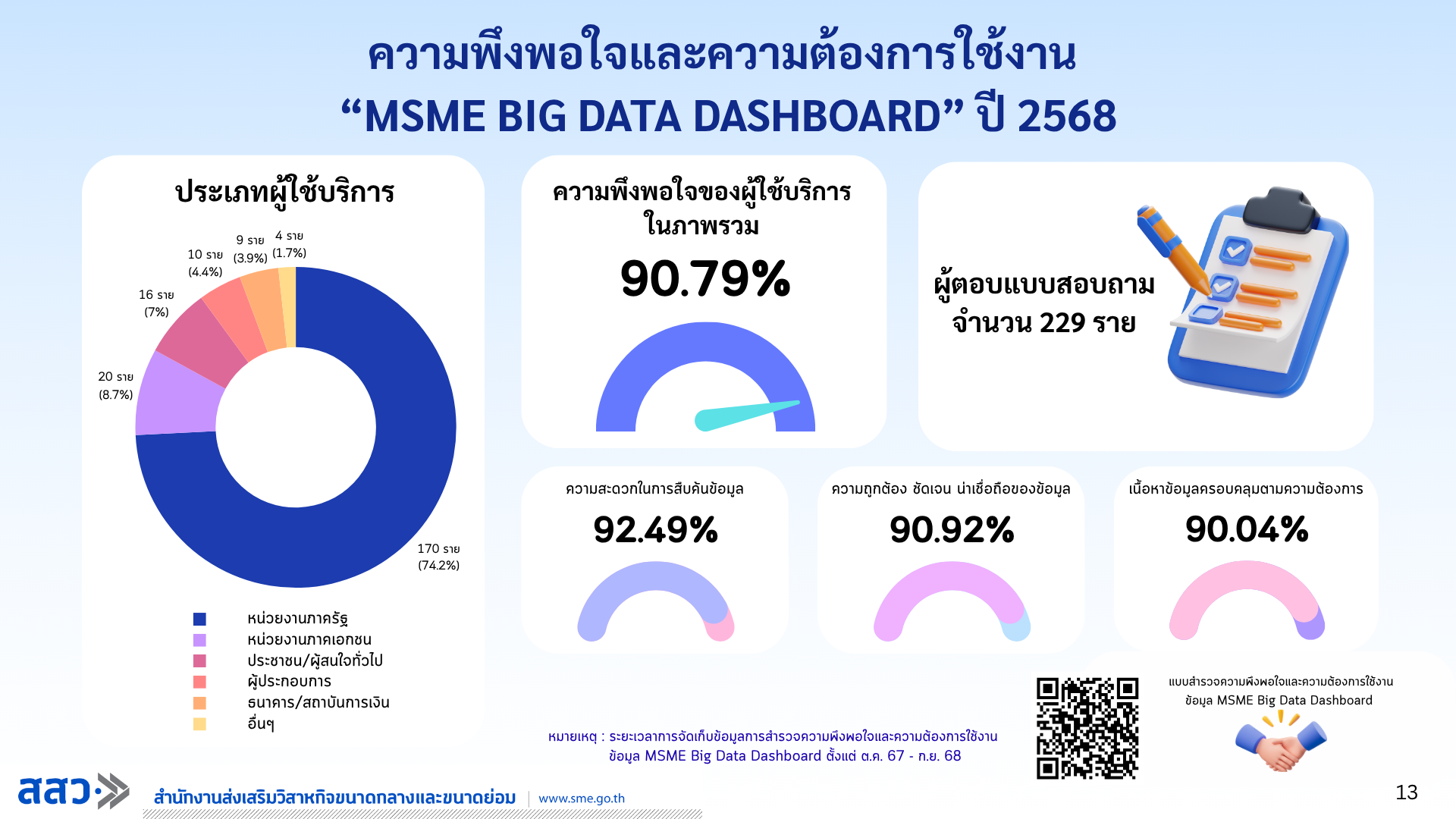 สำนักงานส่งเสริมวิสาหกิจขนาดกลางและขนาดย่อม ได้จัดทำข้อมูล SME Big Data ทำให้สามารถประมวลผลข้อมูลขนาดใหญ่ได้อย่างรวดเร็วและสามารถเชื่อมโยงข้อมูลได้หลายมิติเพิ่มมากขึ้น และได้นำเสนอข้อมูลที่ผ่านการวิเคราะห์และประมวลผลในรุปแบบของ Data Visualization ที่เรียกว่า Dashboard SME Big Data โดยได้บูรณาการและเชื่อมโยงข้อมูลที่สำคัญจากหน่วยงานต่างๆ